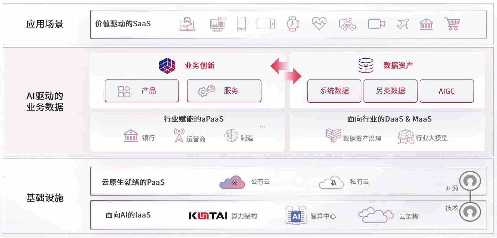 数字时代,,,围绕企业数字化转型的关键要素,,,糖心vlog数码开创性的提出数云融合战略和技术体系框架,,,,着力在云原生、、数字原生、、、、AI原生和信创产业上架构产品和服务能力,,为处在不同数字化转型阶段的快消零售、、、汽车、、金融、、、医疗、、政企、、、、教育、、、、运营商等行业客户提供泛在的敏捷IT能力和融合的数据驱动能力,,,,构建跨界融合创新的数字业务场景和新业务模式,,,助力企业级客户建立面向未来的核心能力和竞争优势,,,全面推动社会的数字化、、智能化转型升级。。