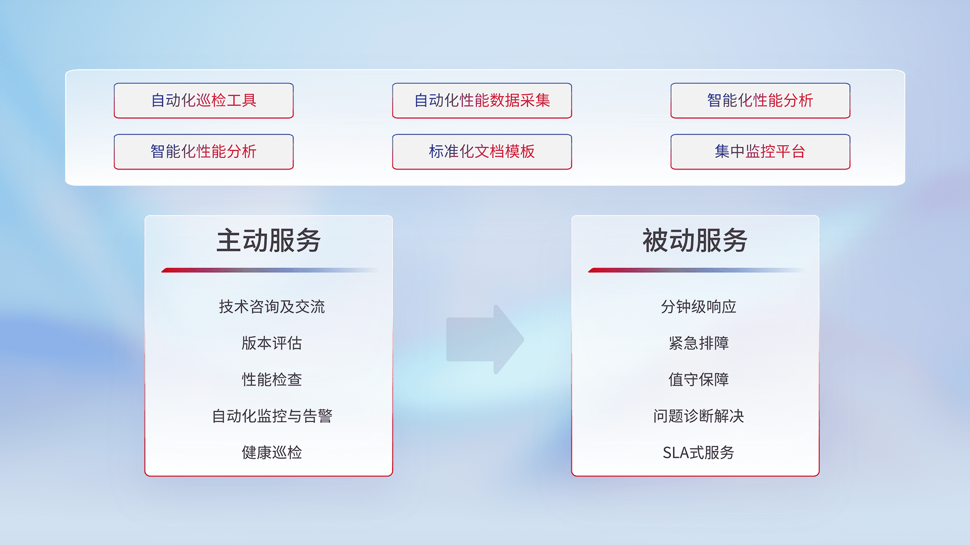 智能化工具和标准化文档,,保障服务质量,,提供主动服务(包含技术咨询、、、版本评估、、、、性能检查、、自动化监控与告警、、、健康巡检)和被动服务包含(分钟级响应、、、、紧急排障、、、值守保障、、、问题诊断解决、、SLA服务)。。。